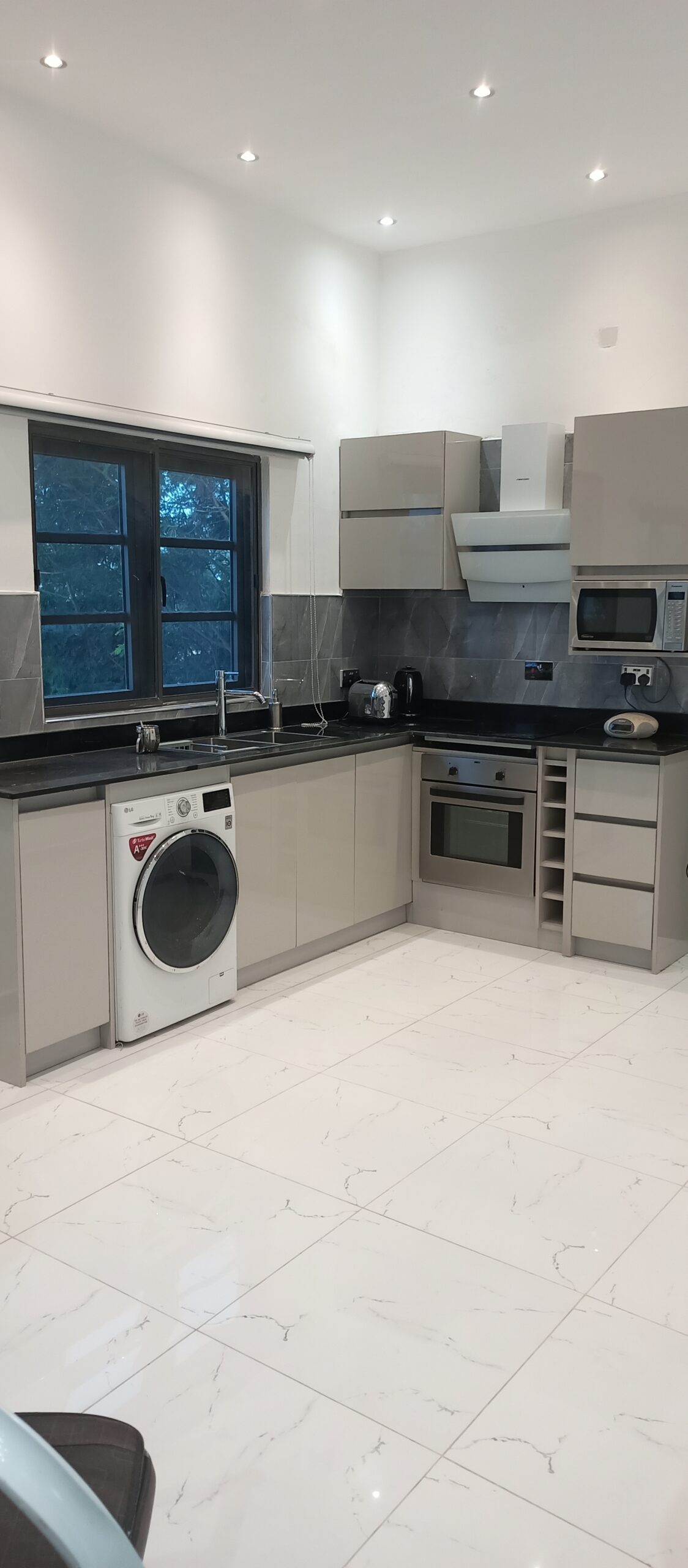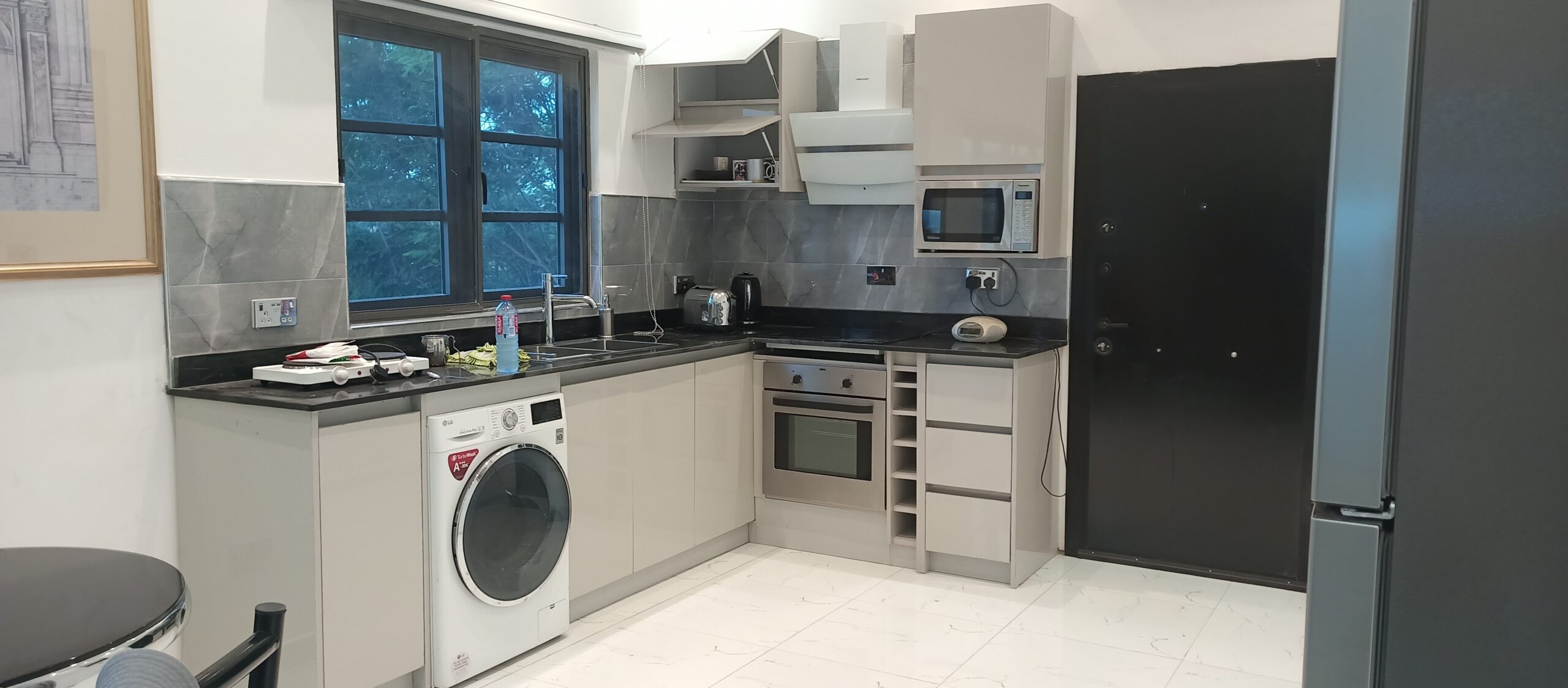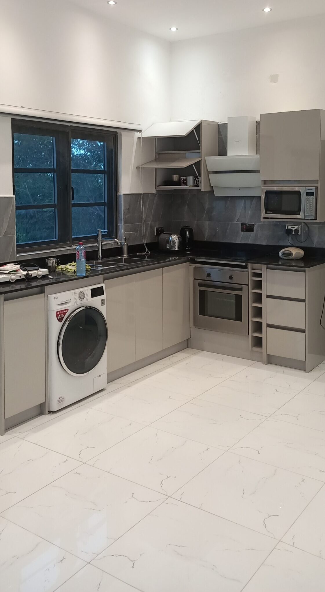 We originally designed this setup for a client at Daras Junction in Teshie who needed a modern look that could handle real daily use. This kitchen is all about being smart with your space. It packs everything you need into one wall—including the washing machine—without making the room feel crowded.