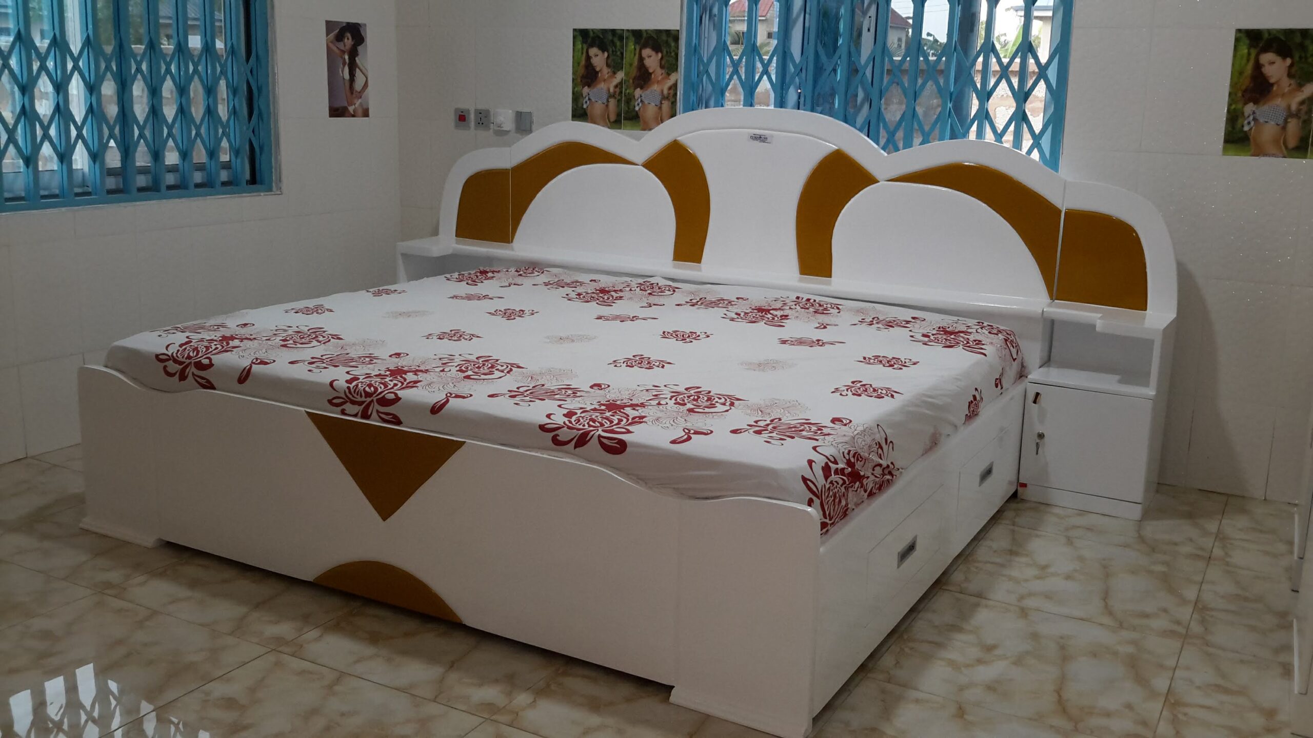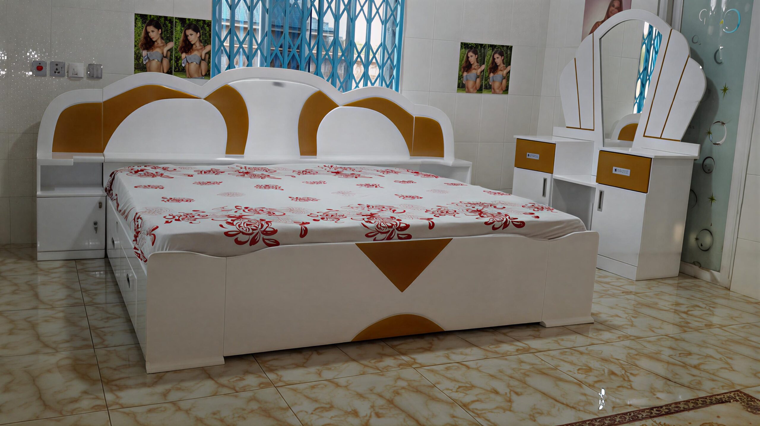 The standout feature is the sculpted headboard, accented with bold gold arches that add a layer of warmth and luxury to the clean white design. But it is not just about looks—it is incredibly practical. We built integrated nightstands directly into the frame (complete with locks for security) so you don’t need to buy separate side tables. Plus, we added deep under-bed storage drawers on the sides, giving you the perfect hidden spot for extra bedsheets or blankets.