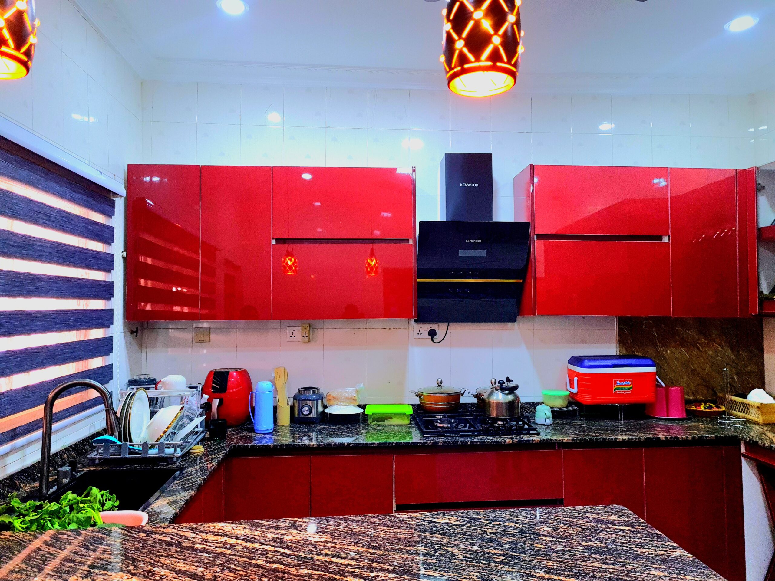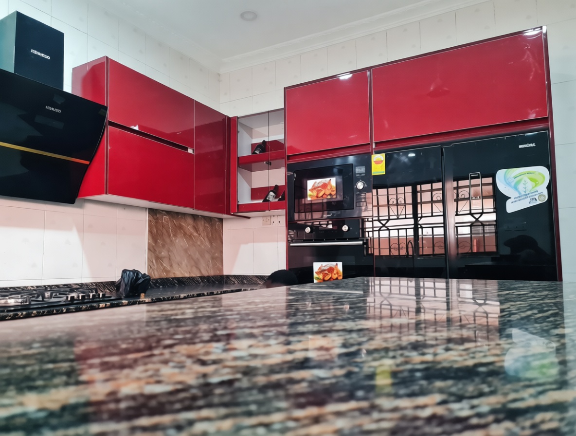 Description: This kitchen is all about making a bold statement. Inspired by the warm evenings in Sakumono, we went with deep cherry-red glossy cabinets that instantly energize the space. It’s not just about the color, though—this layout is designed for socializing.