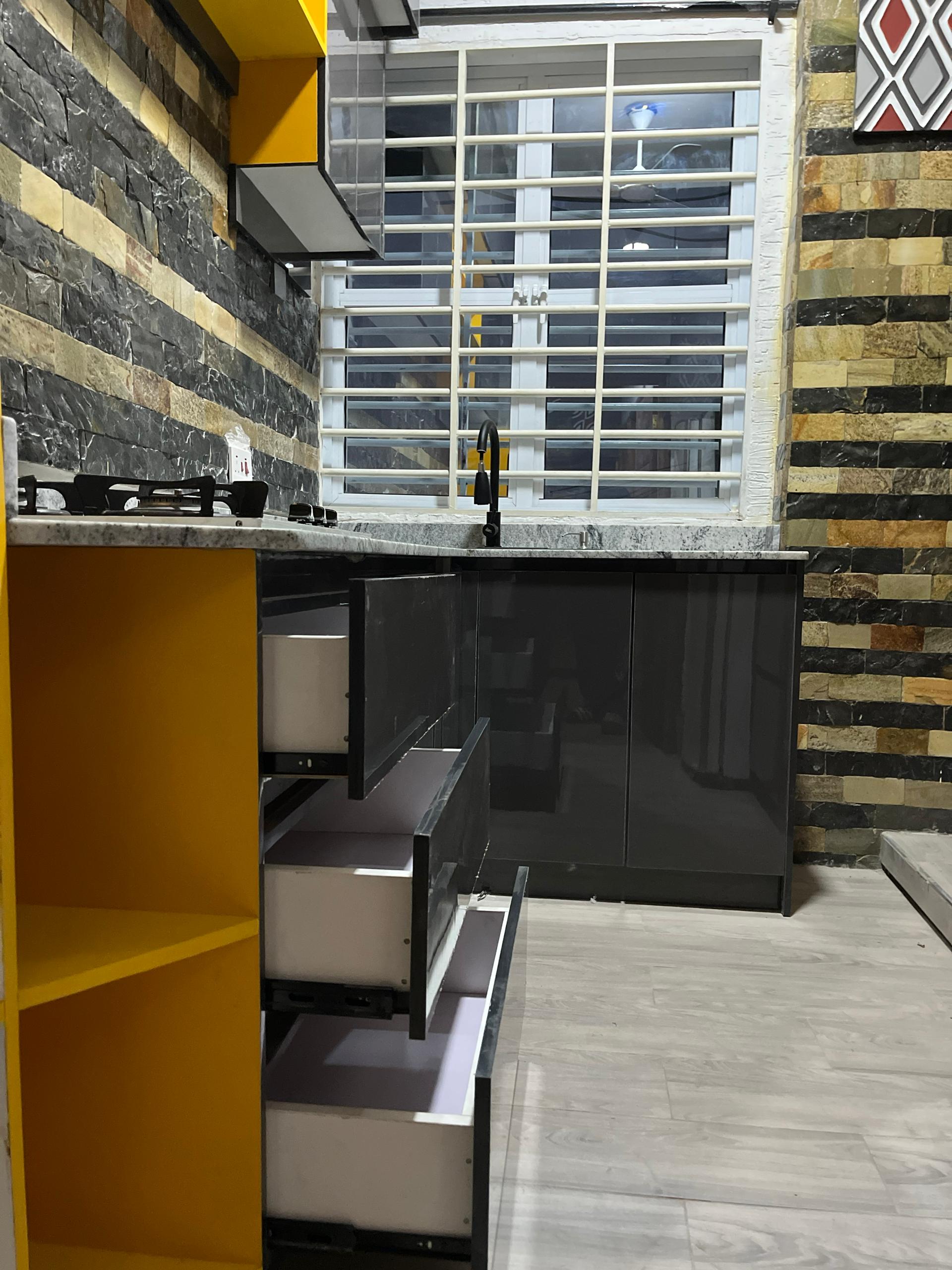 The design uses a clever vertical approach: a floor-to-ceiling natural stone wall draws the eye upward, making the room feel taller and grander. We paired high-gloss charcoal cabinets (to hide stains in a busy area) with vibrant yellow open shelving that keeps the space feeling airy rather than boxed in. It’s the ultimate solution for studio apartments, guest wings, or office kitchenettes.